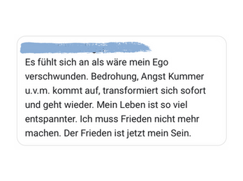 Du transzendierst vom begrenzten Ich-Gefühl (=„Ego”) zum offenen Raum-Bewusstsein. Frieden ist nicht mehr ein Zustand, den du erreichen musst. Frieden wird dein Zuhause, in dem du auch im Alltag mühelos bleibst.